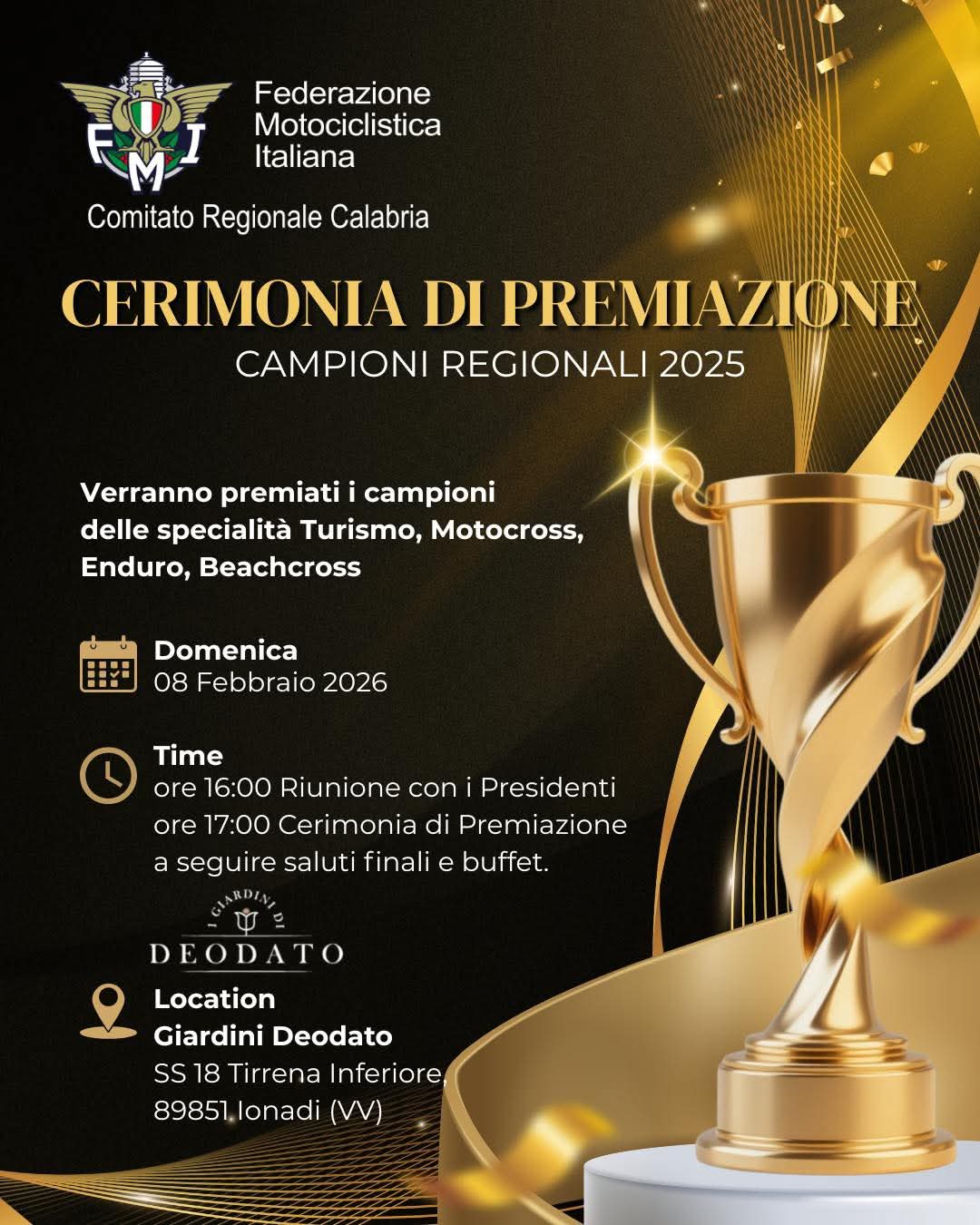 Si comunica che è convocata una riunione con i Presidenti dei Moto Club il giorno 8 febbraio 2026 presso la sala convegni GIARDINI DEODATO sita in S.S. 18 Tirrena Inferiore ad Jonadi (VV) alle ore 16:00